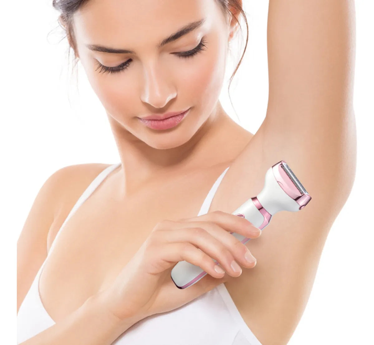 - Esta depilación tiene 4 cabezales de fijación, 1 afeitadora facial, 1 recortadora de cejas, 1 recortadora de nariz, 1 afeitadora corporal. Disponible para eliminar vello en cara, brazos, piernas, líneas de bikini, nariz, cejas, etc.