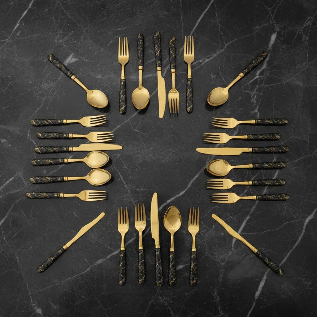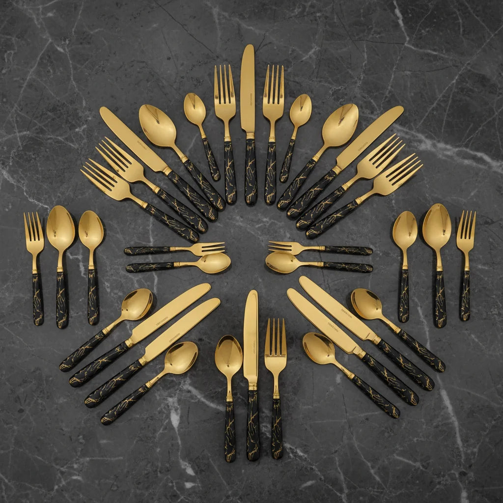 Este set no solo ofrece cubiertos, sino una declaración de estilo. Cada pieza, con su diseño en oro y negro, está pensada para realzar sus reuniones y deleitar a sus invitados, transformando cada comida en un evento memorable y sofisticado. Es la distinción que su mesa merece.